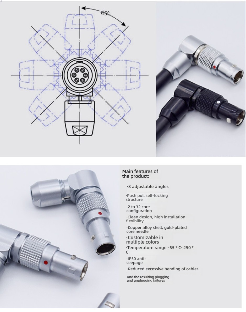 The FSG right-angle aviation plug 0T/1T/2T series is designed with a 360° adjustable cable exit, allowing flexible routing in tight or complex installation environments. Its waterproof design ensures reliable performance in harsh industrial, medical, and aerospace applications.