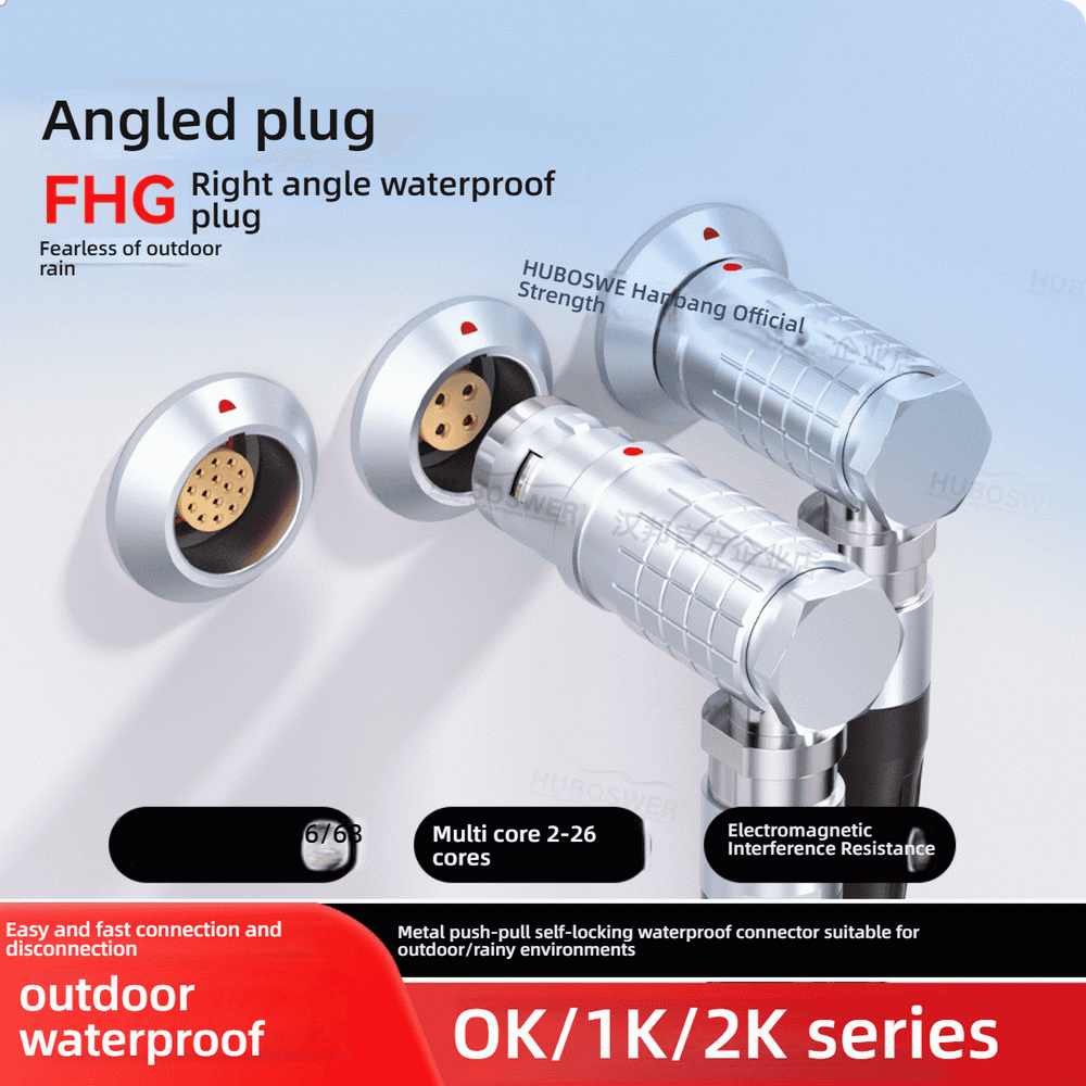 High-quality LEMO 90° FHG right-angle connector 0K/1K/2K with 2-26 pins. IP66/IP68 waterproof, push-pull self-locking design. Ideal for outdoor, industrial, and automation applications.