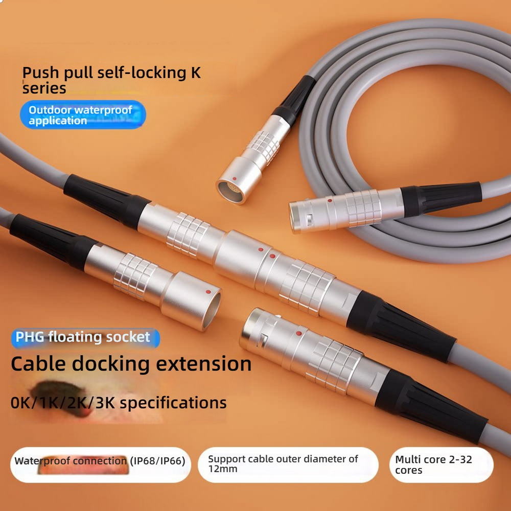 High-quality LEMO PHG floating socket cable extension 0K/1K/2K/3K. IP66/IP68 rated waterproof push-pull self-locking connector for industrial, marine, automation, and outdoor applications.