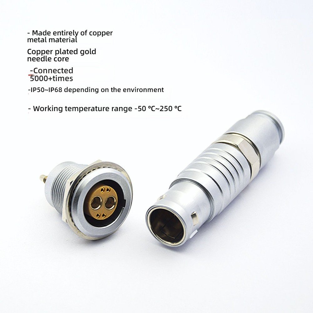 Premium miniature LEMO connector for aerospace, industrial, and medical applications. Multi-circuit, coaxial, pneumatic and electric hybrid design with push-pull self-locking mechanism, rugged metal housing, and high reliability for harsh environments. Ideal for mixed signal and power transmission.
