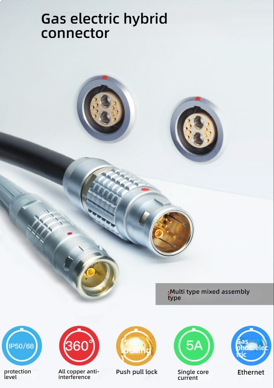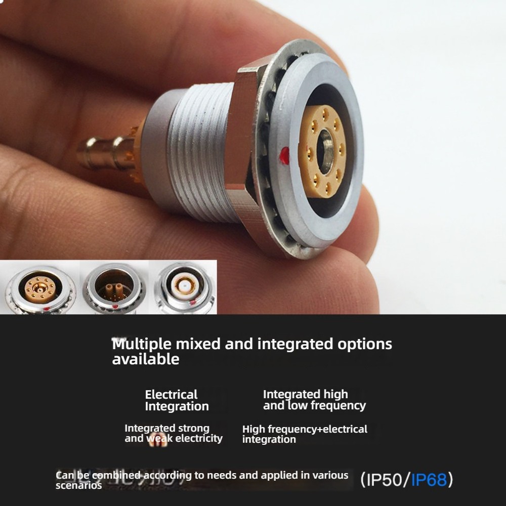 This miniature multi-circuit coaxial pneumatic and electric hybrid connector offers a robust solution for aerospace, industrial automation, and medical device applications. Engineered with precision, this LEMO-style push-pull self-locking metal aviation connector combines multiple circuits, coaxial lines, and pneumatic pathways in a single integrated unit.