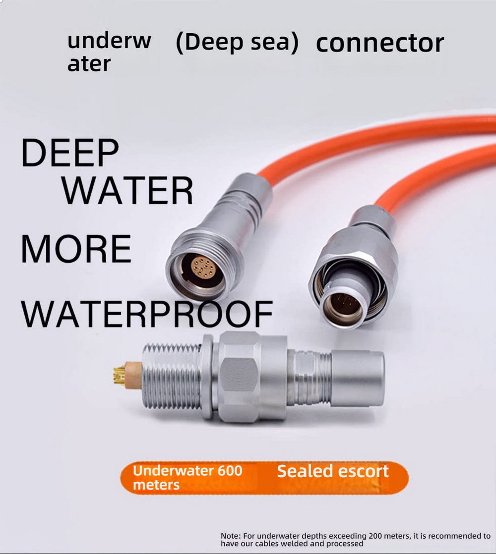 This miniature waterproof underwater connector is designed for UAVs, submersible robots, and deep-sea applications requiring compact, reliable, and durable connections. Rated for 600 meters of depth, this IP68 circular connector ensures secure push-pull self-locking connections in harsh underwater environments.